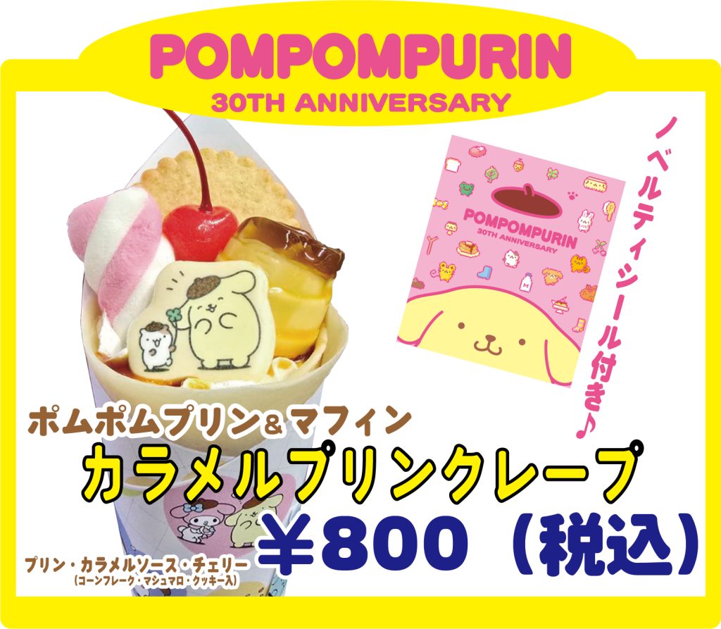 「ポムポムプリン&マフィン カラメルプリンクレープ」をお買上げの方には可愛いノベルティシールをプレゼント!